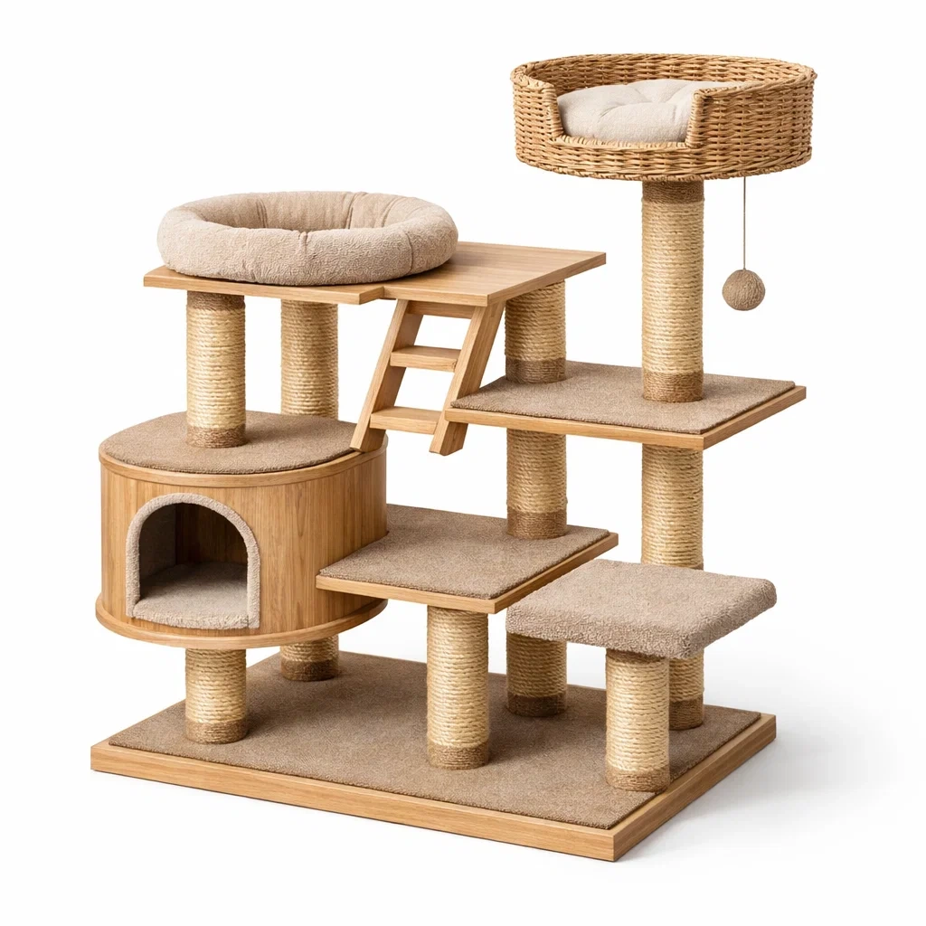 Arbre à chat en bois avec revêtement en tissu doux et corbeille en osier. Comprend cinq plateformes, une niche, des poteaux recouverts de sisal pour faire les griffes, et une échelle. Dimensions : hauteur 110 cm, largeur 75 cm, profondeur 45 cm. Poids total : 12.5 kg.