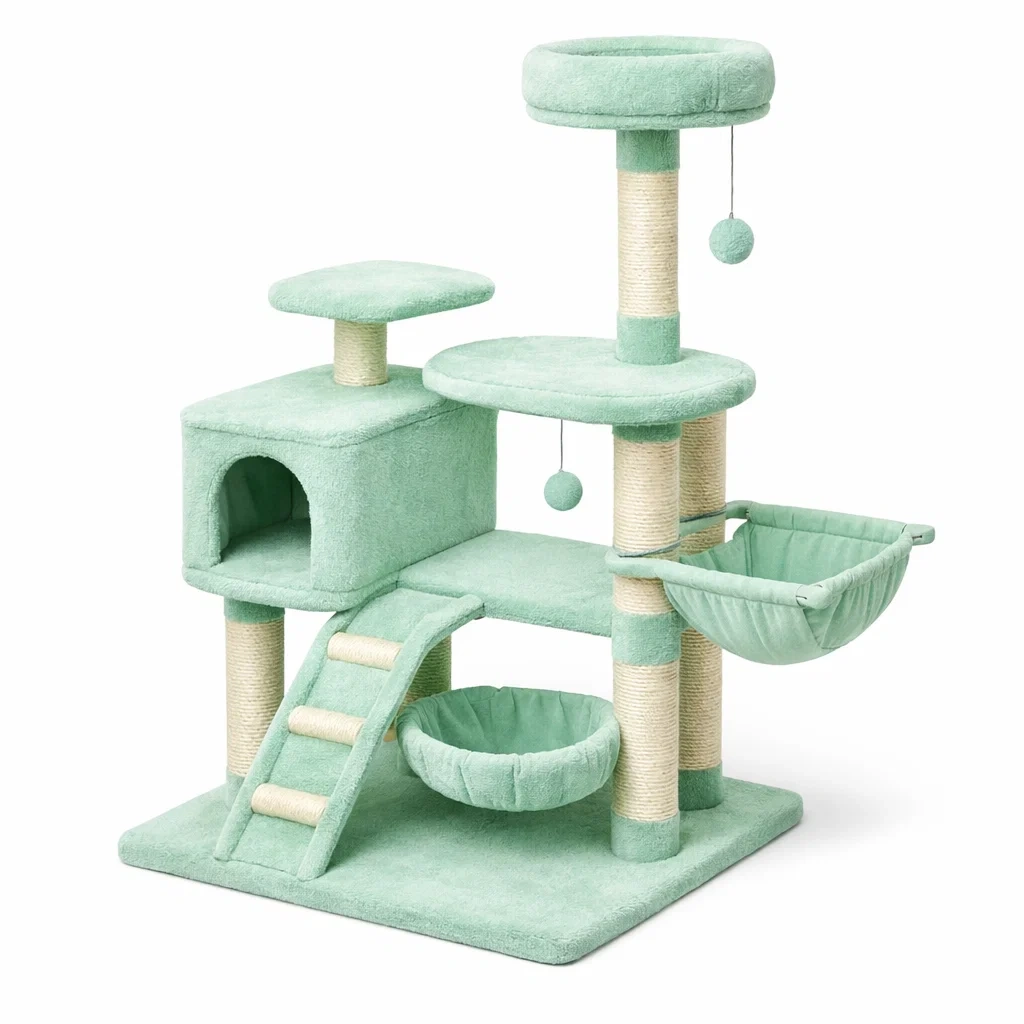 Arbre à chat multifonctionnel avec plusieurs plateformes et zones de repos. Équipé de jouets suspendus pour divertissement.