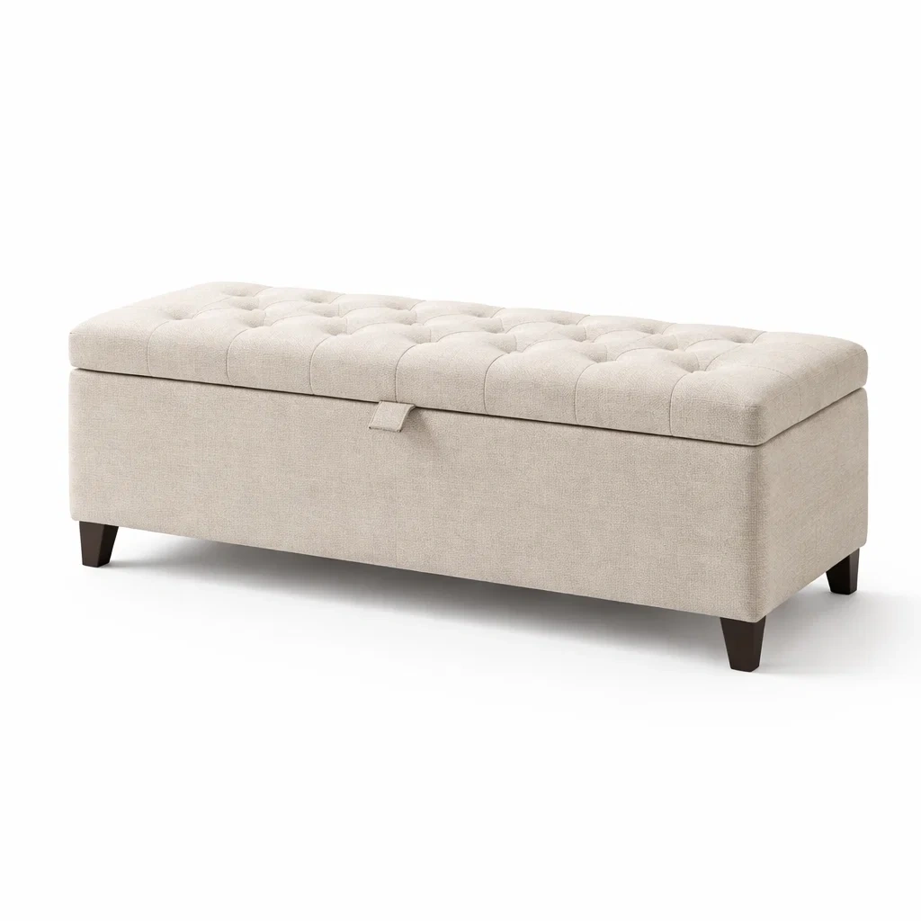Le banc coffre présente un revêtement en lin avec un rembourrage en mousse de polyuréthane. Les pieds sont en bois massif, assurant une structure robuste. Dimensions : longueur 120 cm, largeur 45 cm, hauteur 45 cm. Couleur : Beige. Ce banc intègre un espace de rangement sous l'assise capitonnée. Poids : 15 kg.