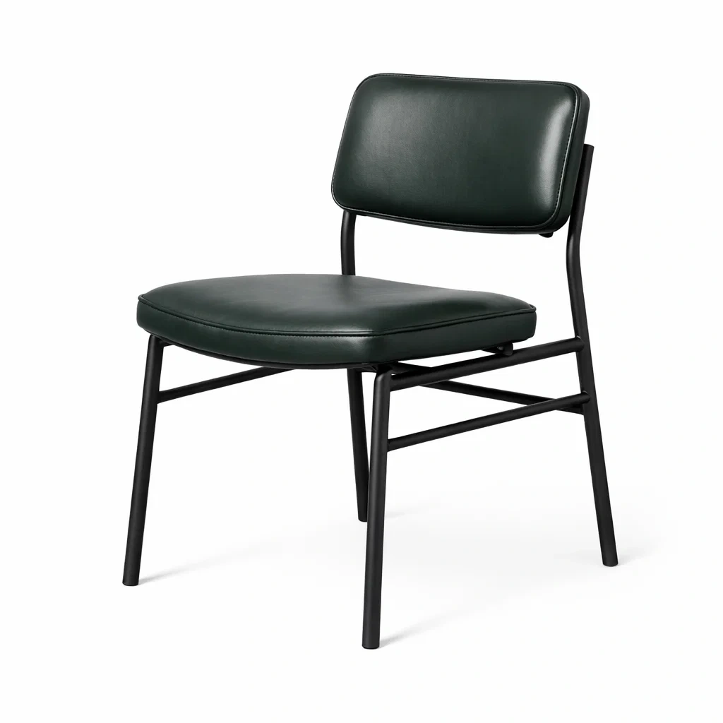 Chaise avec structure en métal tubulaire et finition peinture époxy. Le revêtement est en similicuir PU de couleur vert foncé. L'assise et le dossier sont rembourrés avec une mousse dense pour un soutien confortable. Dimensions: Longueur 45 cm x Largeur 53 cm x Hauteur 82 cm. Poids maximal supporté: 120 kg.